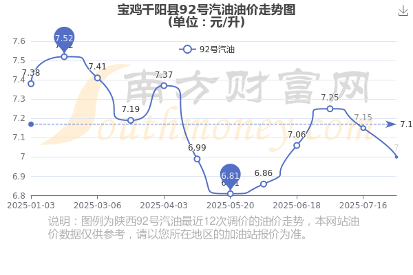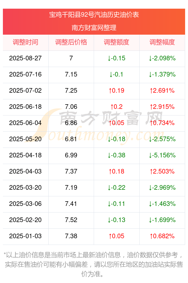 9月8日宝鸡千阳县92号汽油价格查询:每升7元(8月27日油价调整后的价格),相对上次调整时间7月16日的油价7.15元每升,下降了0.15元,下降2.098%。