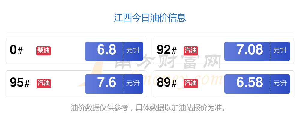 江西汽油、柴油9月27日每升最新价格为8月27日调整后的价格,92号汽油为7.08元,降了0.14元;95号汽油为7.6元,降了0.15元;89号汽油为6.58元,降了0.13;0号柴油为6.8元,降了0.15元。