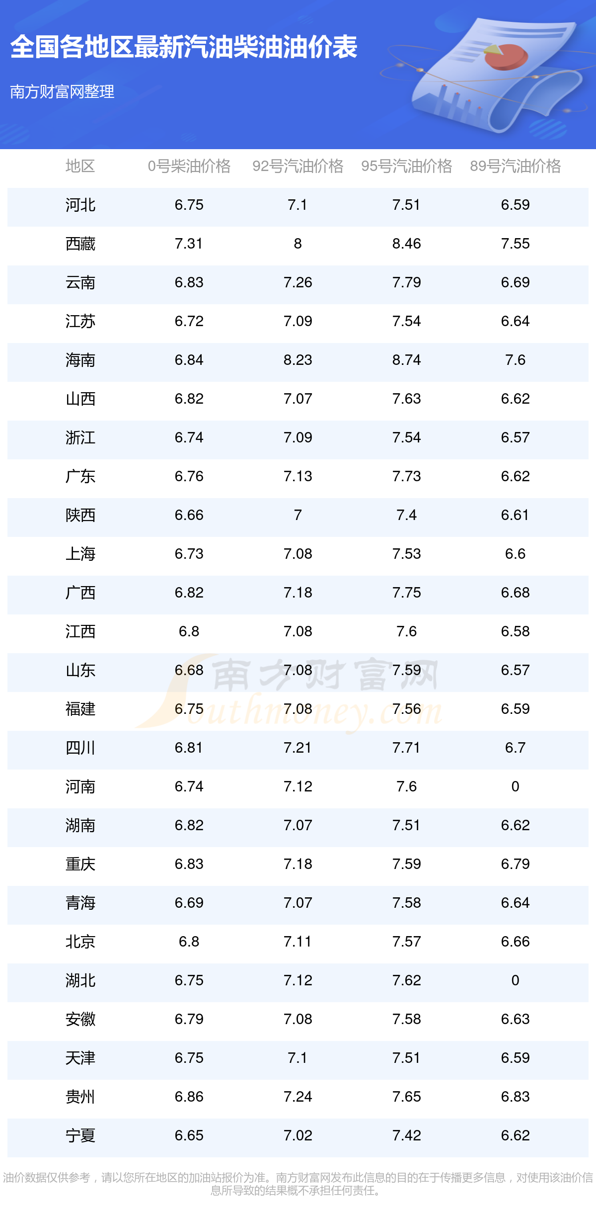 油价数据仅供参考,请以您所在地区的各加油站报价为准。