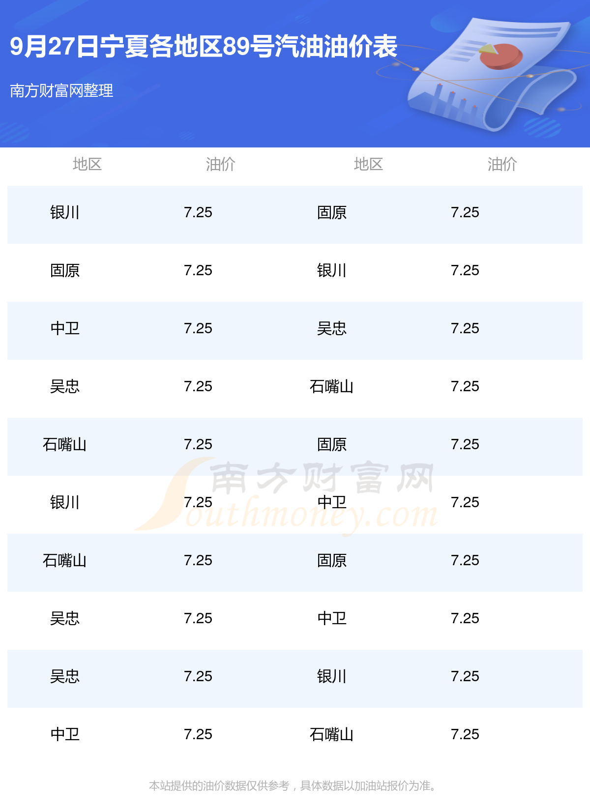 宁夏89号汽油9月27日价格为6.62元/升,调整时间为8月27日,相对上次调整跌了0.14元,跌2.071%。