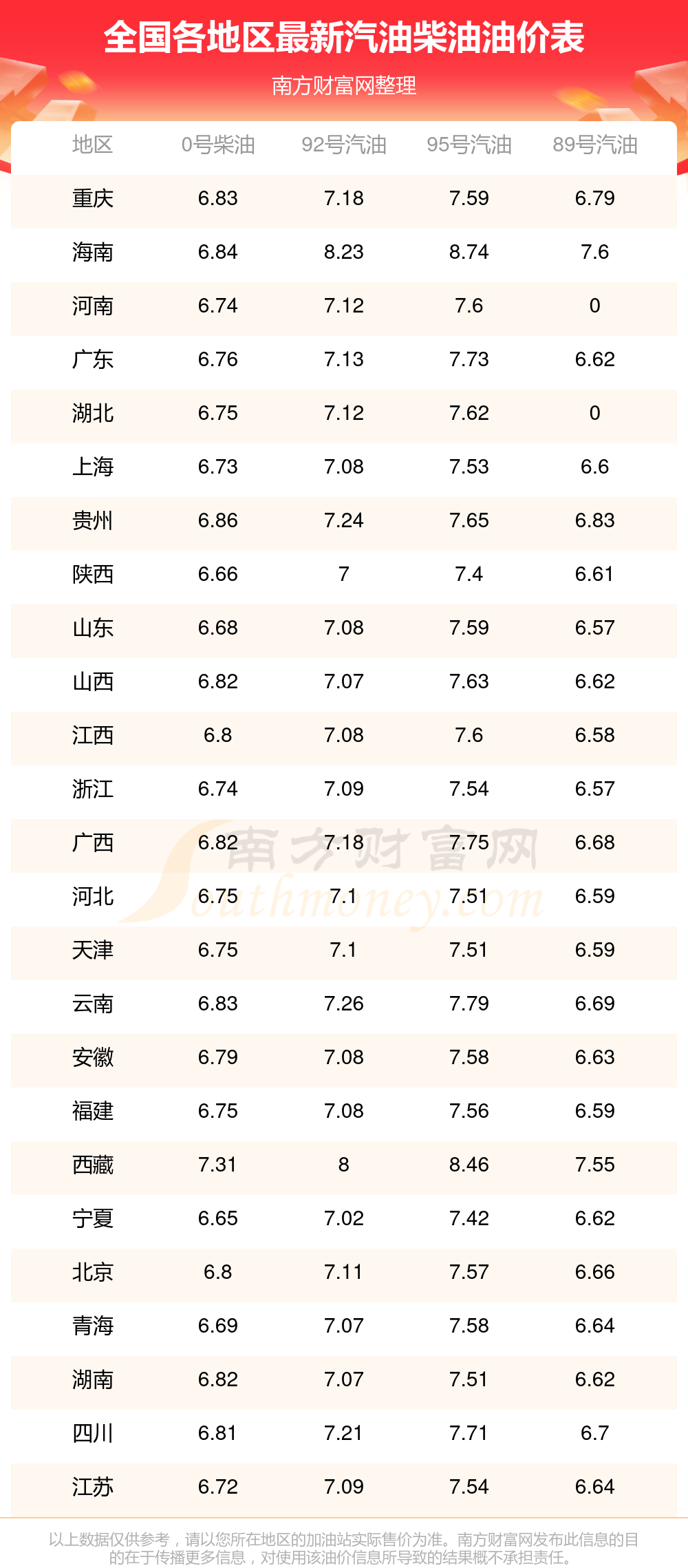 油价数据仅供参考,请以您所在地区的加油站报价为准。油价发布此信息的目的在于传播更多信息,对使用该油价信息所导致的结果概不承担任何责任。