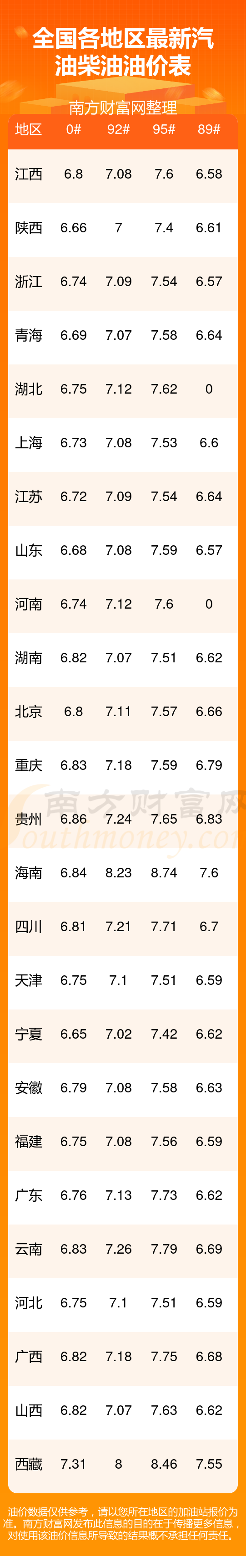 以上数据仅供参考,请以您所在地区的加油站实际售价为准。油价发布此信息的目的在于传播更多信息,对使用该油价信息所导致的结果概不承担责任。