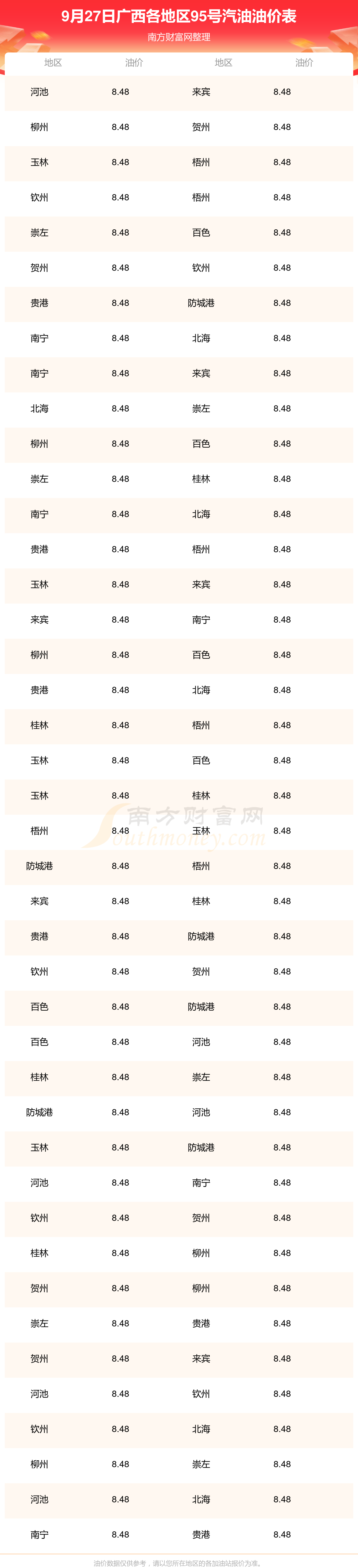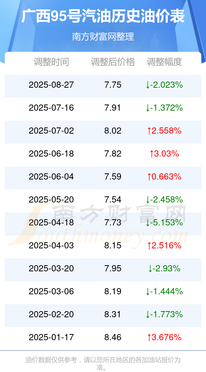 9月27日,广西95号汽油的这些价格为7.75元每升,调整时间为8月27日,相对上次调整降了0.16元,降2.023%。