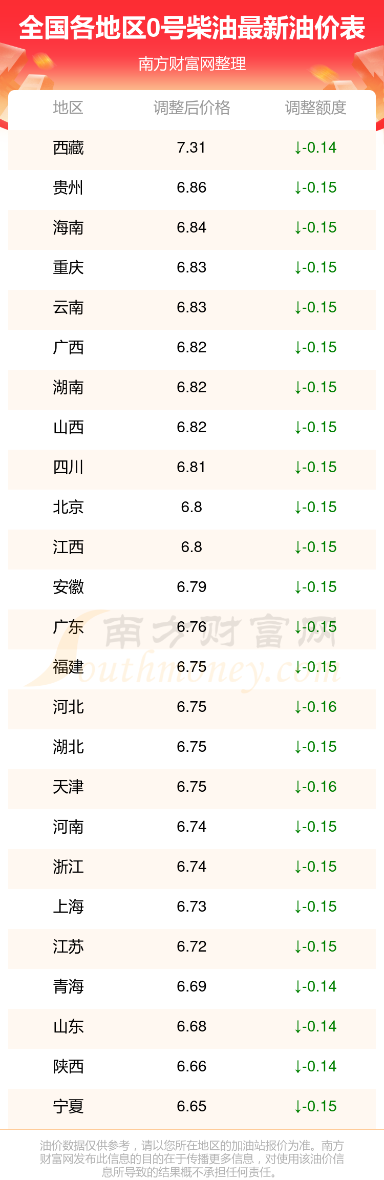 9月27日全国0号柴油最新平均价格为7元每升,本次油价格调整时间为8月27日,其中,全国0号柴油最低为宁夏,价格6.65元/升,0号柴油最高为西藏,价格7.31元/升。