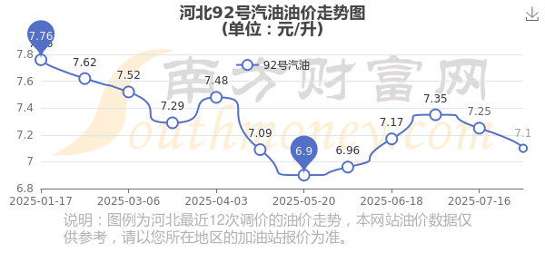 9月27日,河北92号汽油的价格是7.1元每升,本次的调整时间为8月27日,对比上次的调整减了0.15元,减2.069%,10月13日24时为下一轮油价调整时间,还有16.96天。