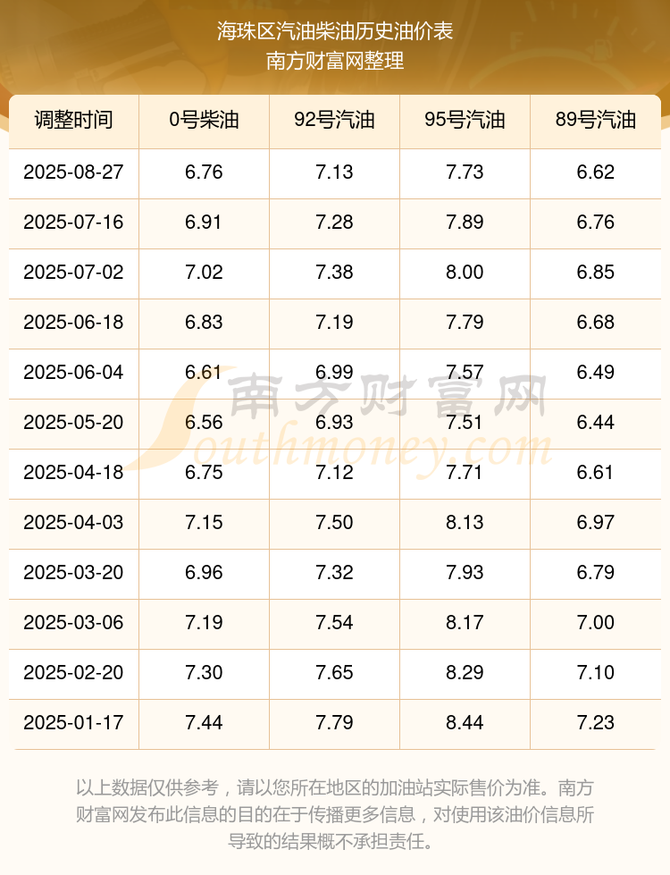 海珠区汽油、柴油9月27日的价格是多少钱一升?具体如下:92号汽油为7.13元,跌了0.15元;95号汽油为7.73元,跌了0.16元;89号汽油为6.62元,跌了0.14元;0号柴油为6.76元,跌了0.15元,本轮油价的调整时间为8月27日。
