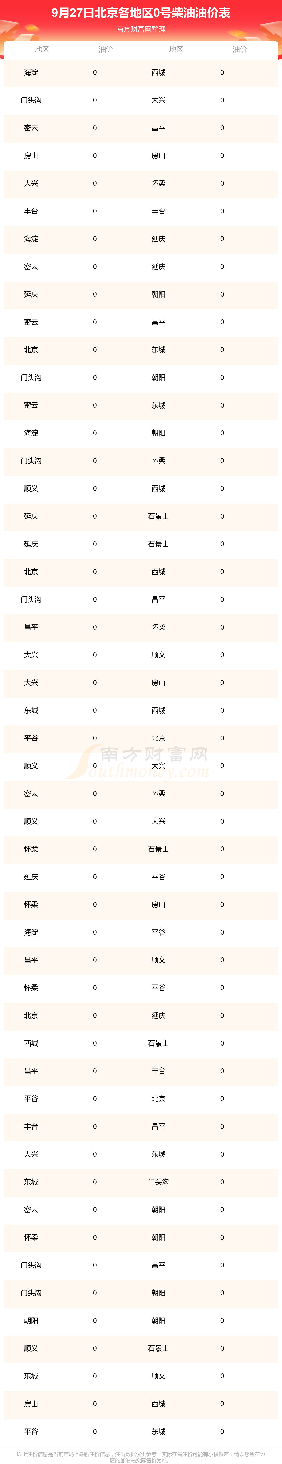 北京各地区最新0号柴油油价表