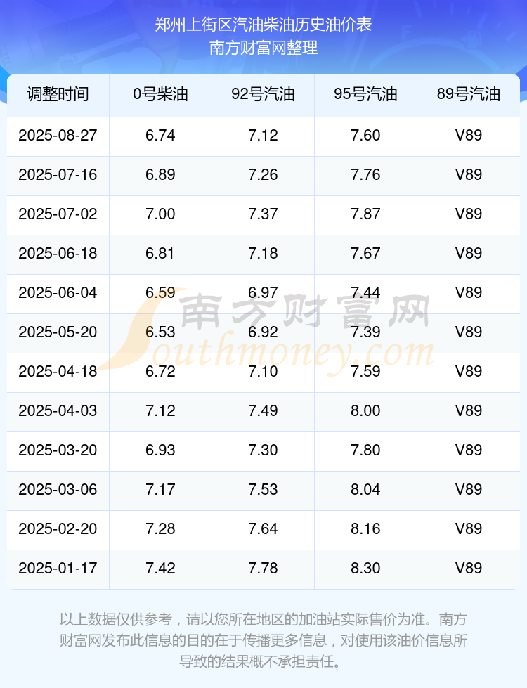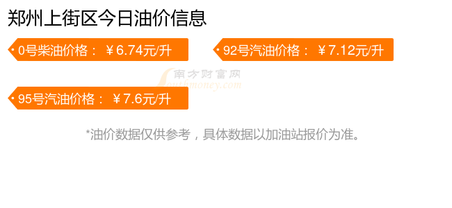 9月27日郑州上街区汽油、柴油价格是8月27日调整后的价格,每升价格具体为:92号汽油为7.12元,减了0.14元,减幅达1.93%;95号汽油为7.6元,减了0.16元,减幅达2.06%;0号柴油为6.74元,减了0.15元,减幅达2.18%。
