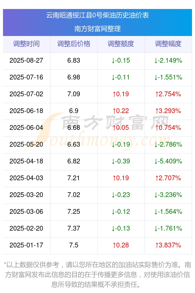 云南昭通绥江县0号柴油历史油价表