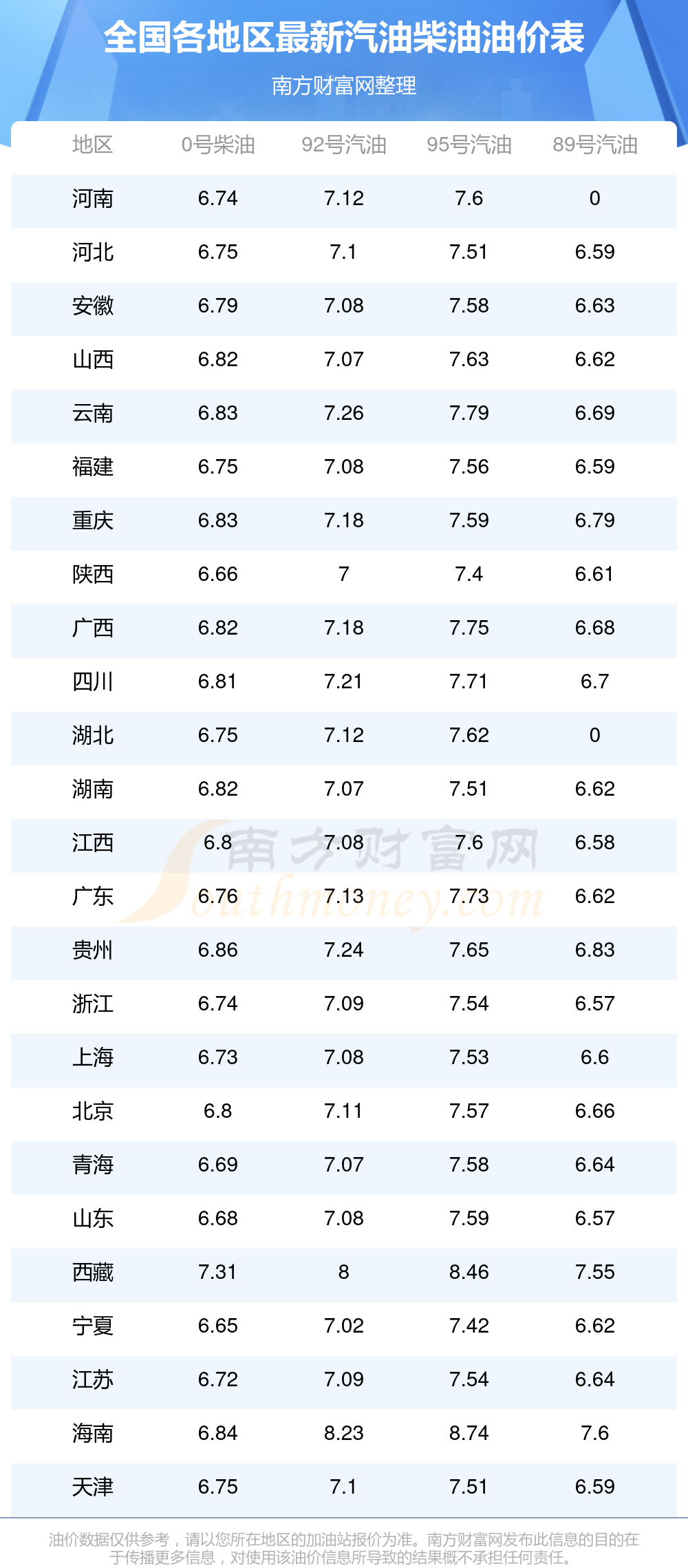 以上数据仅供参考,请以您所在地区的加油站实际售价为准。油价发布此信息的目的在于传播更多信息,对使用该油价信息所导致的结果概不承担责任。