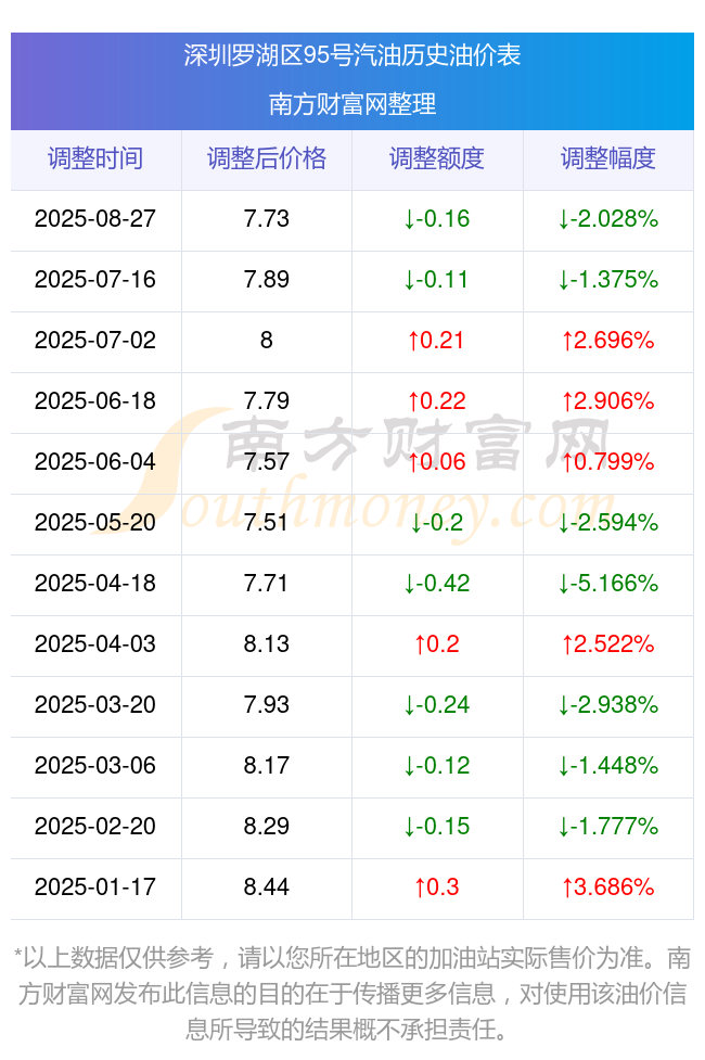 9月27日,深圳罗湖区最新价格为:7.73元每升,调整时间为8月27日,相对上次调整时间7月16日的油价7.89元每升,减了0.16元,减幅达2.028%。