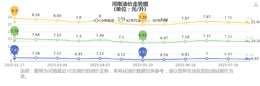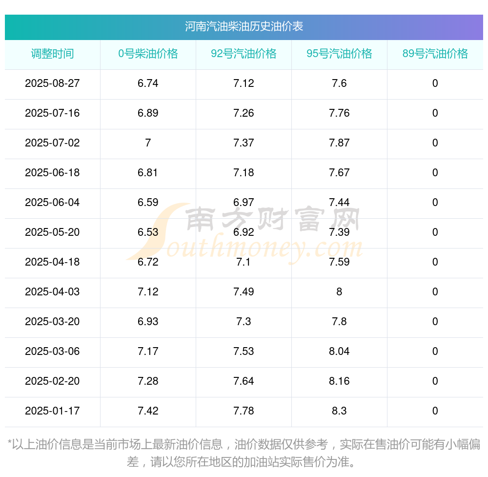 9月27日,河南汽油、柴油每升的价格为:92号汽油7.12元,减了0.14元;95号汽油7.6元,减了0.16元;0号柴油为6.74元,减了0.15元,本轮调整时间是8月27日。
