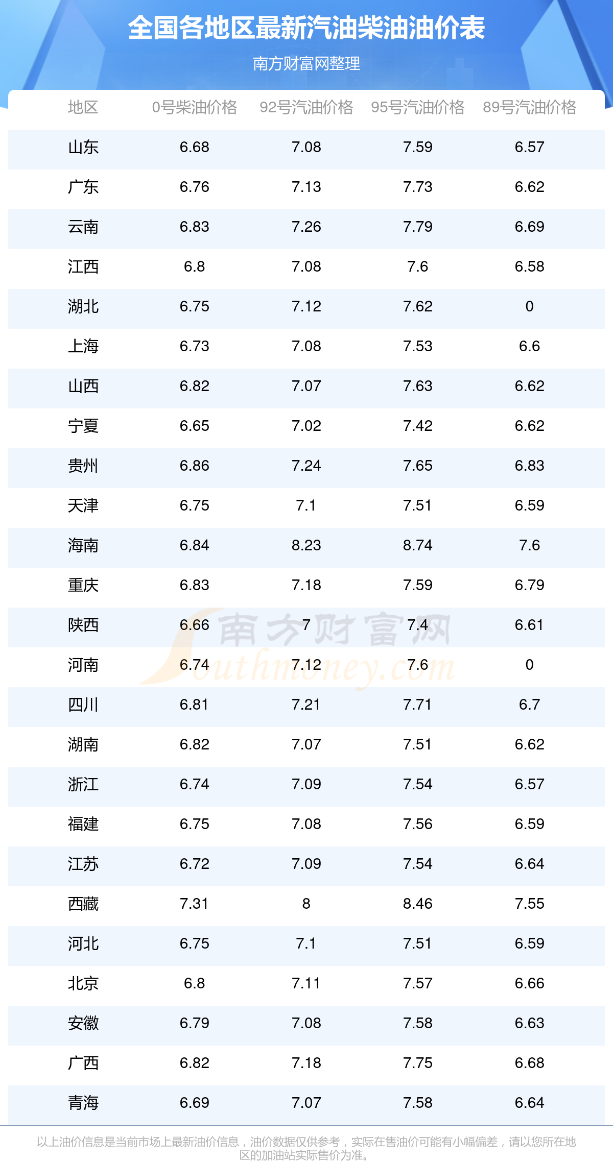 油价数据仅供参考,请以您所在地区的各加油站报价为准。