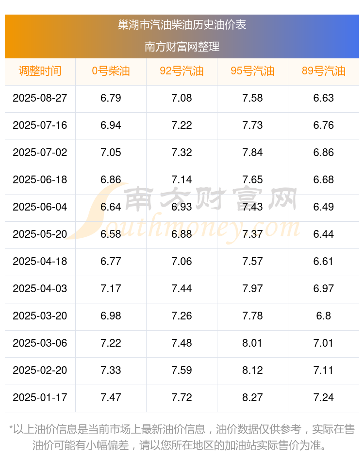 巢湖市汽油、柴油9月27日每升最新价格为:92号汽油为7.08元;95号汽油为7.58元;89号汽油为6.63元;0号柴油为6.79元,调整时间为8月27日。