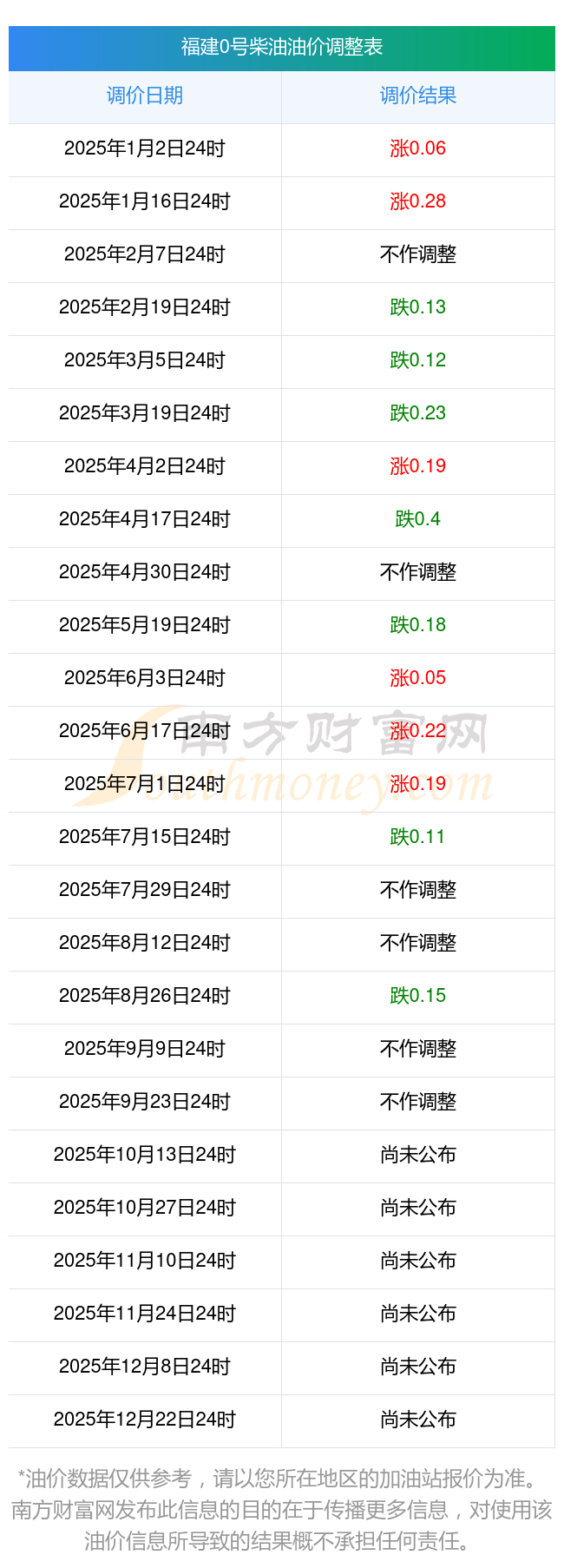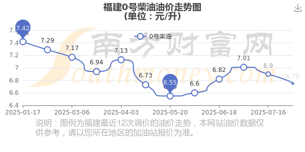 9月27日,福建0号柴油的价格是6.75元每升,本次的调整时间为8月27日,对比上次的调整下跌了0.15元,下跌2.174%,下次调整时间为10月13日24时,还有16.96天。