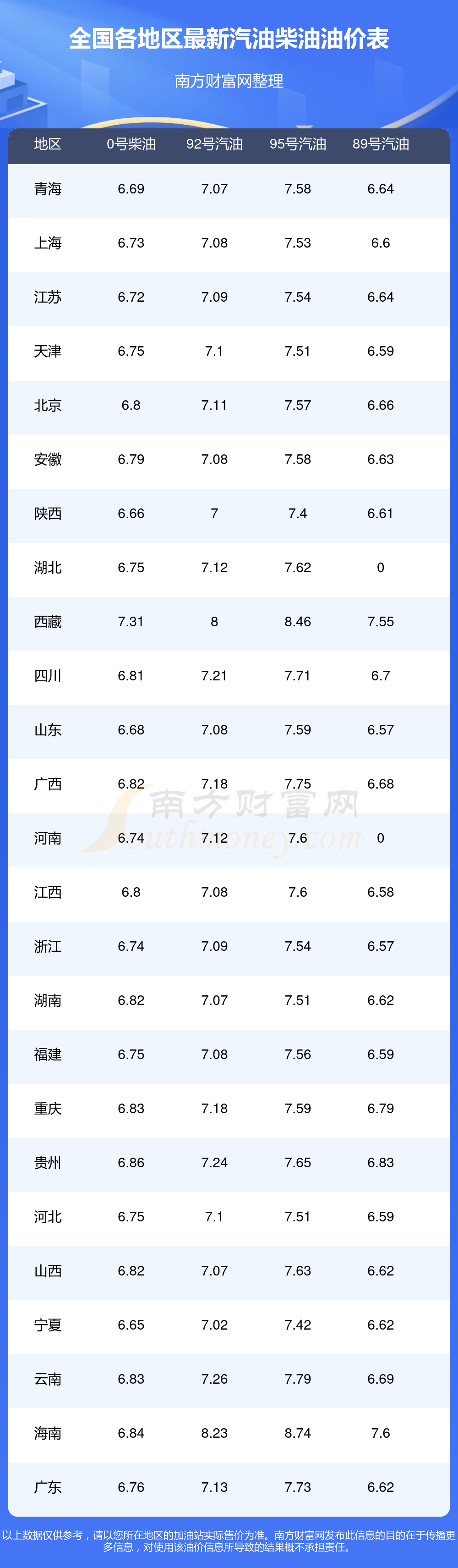 以上数据仅供参考,请以您所在地区的加油站实际售价为准。油价发布此信息的目的在于传播更多信息,对使用该油价信息所导致的结果概不承担责任。
