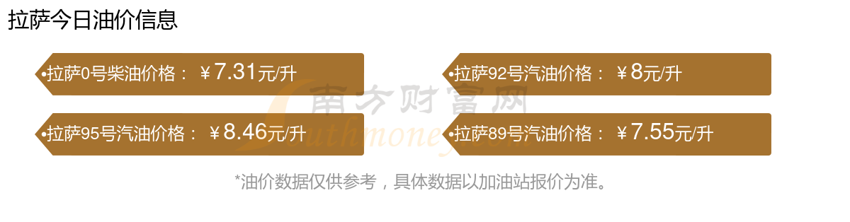 拉萨汽油、柴油9月27日每升的价格为8月27日调整后的价格:92号汽油8元;95号汽油8.46元;89号汽油7.55元;0号柴油7.31元。