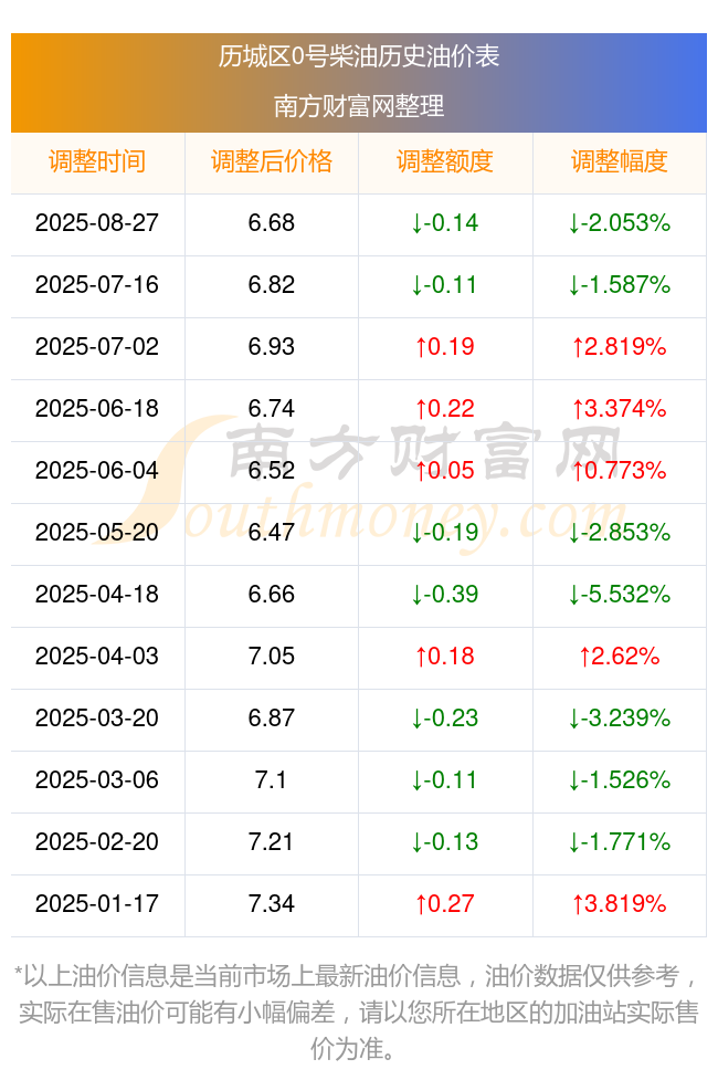 历城区0号柴油9月27日最新价格为6.68元每升,本轮油价调整时间为8月27日,相对上次调整时间7月16日的油价6.82元每升,共下降了0.14元,下降2.053%。