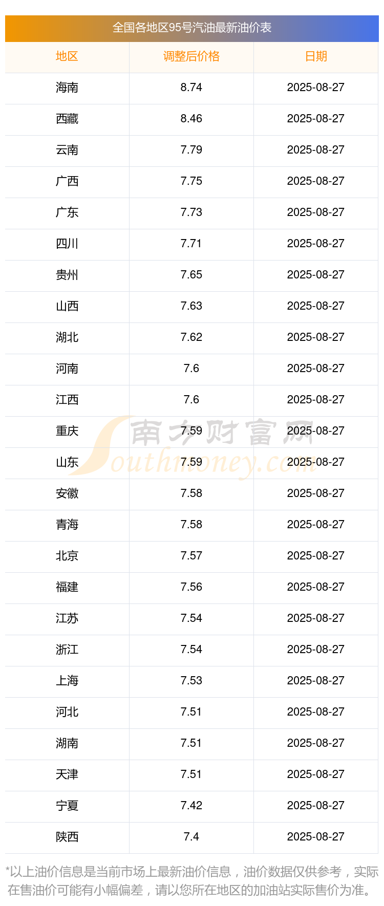 全国各地区最新95号汽油油价表