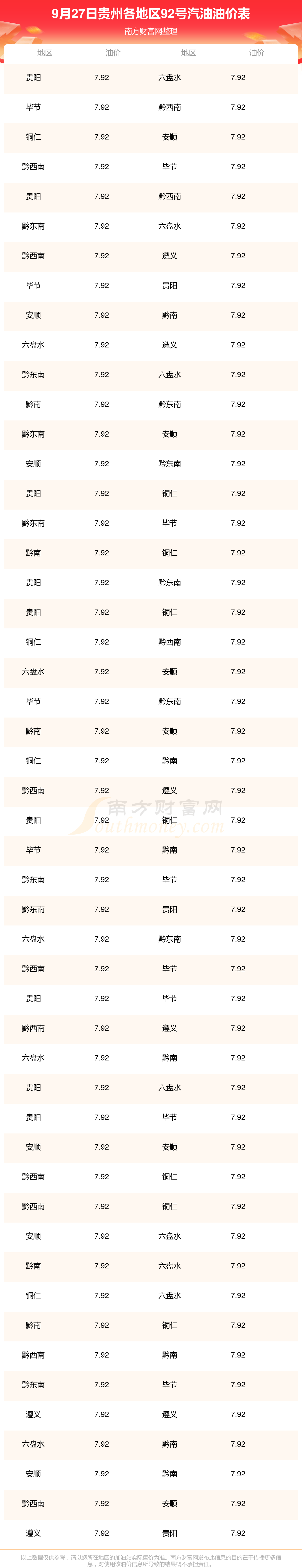 贵州各地区最新92号汽油油价表
