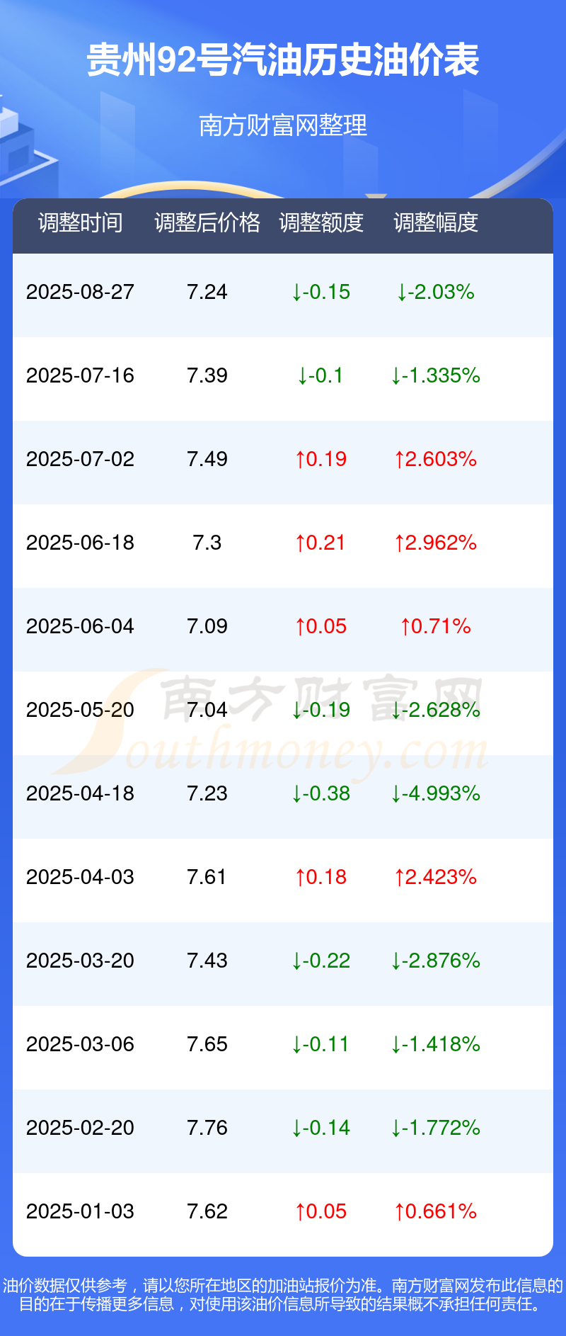 9月27日贵州92号汽油价格为7.24元/升,调整时间为8月27日,相对上次调整时间7月16日的油价7.39元/升,下降了0.15元。