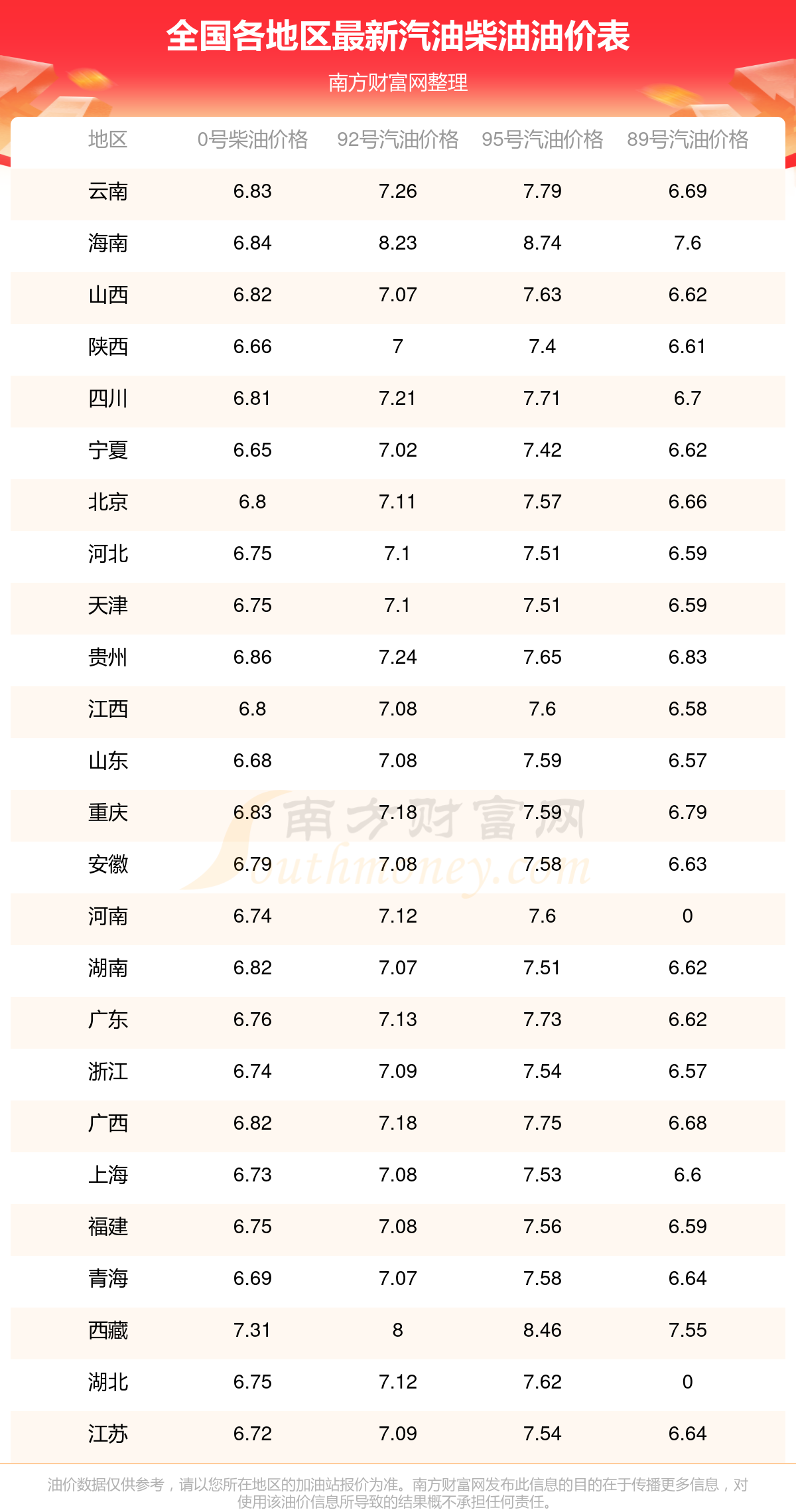 油价数据仅供参考,请以您所在地区的各加油站报价为准。
