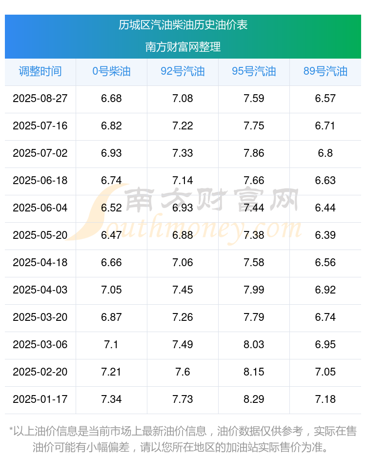 历城区汽油、柴油9月27日每升最新价格为:0号柴油为6.68元,跌了0.14元;95号汽油为7.59元;92号汽油为7.08元;89号汽油为6.57元,调整时间为8月27日。