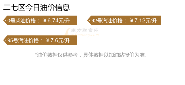 二七区汽油、柴油9月27日每升最新价格:92号汽油为7.12元;95号汽油为7.6元;0号柴油为6.74元,本轮油价调整时间为8月27日。