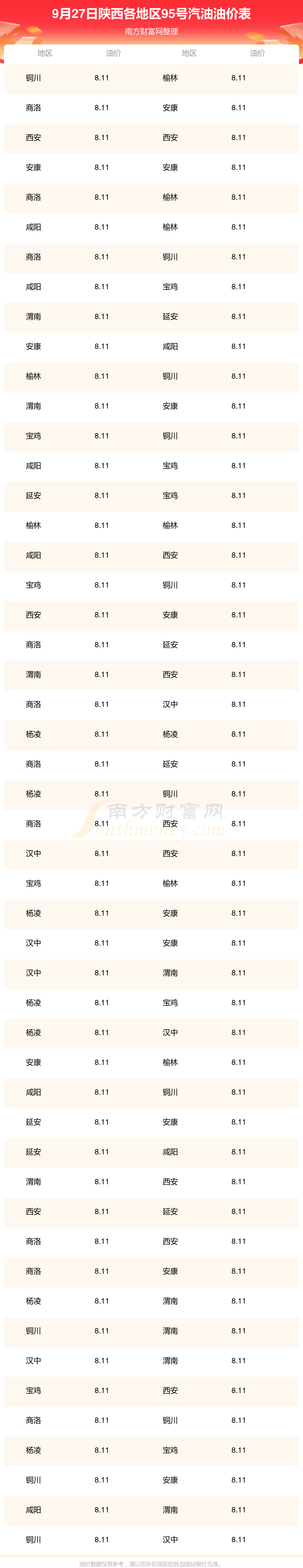 陕西95号汽油9月27日的价格是7.4元每升,这是8月27日调整后的价格,相对比上次调整时间7月16日的油价7.55元每升,跌了0.15元。