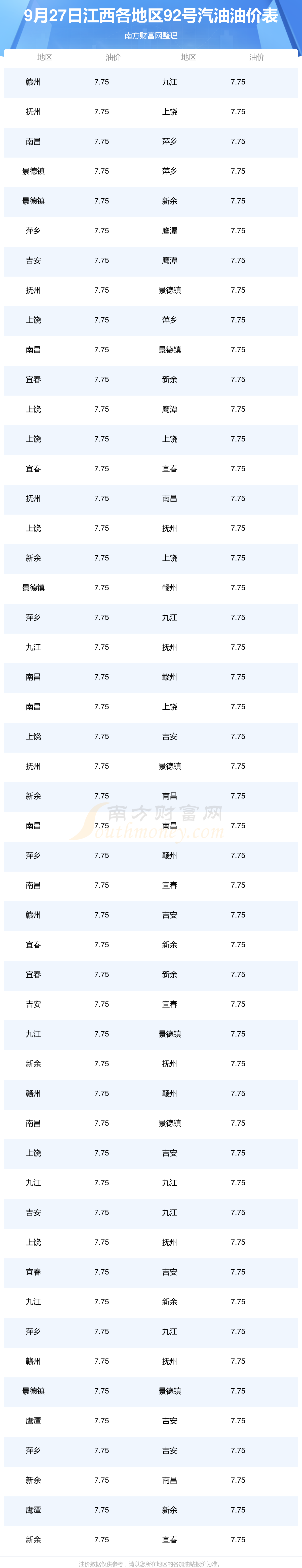 江西92号汽油9月27日的最新油价是7.08元/升,本轮油价调整时间是8月27日,对比上次共下调了0.14元,下调1.939%。