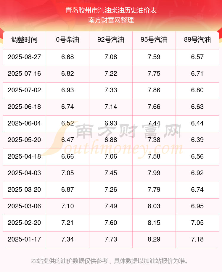 9月27日青岛胶州市汽油、柴油价格是多少钱一升?8月27日油价调整后,每升油价为:92号汽油为7.08元,下跌了0.14元,下跌幅达1.94%;95号汽油为7.59元,下跌了0.16元,下跌幅达2.07%;89号汽油为6.57元,下跌了0.14元,下跌幅达2.09%;0号柴油为6.68元,下跌了0.14元,下跌幅达2.05%。