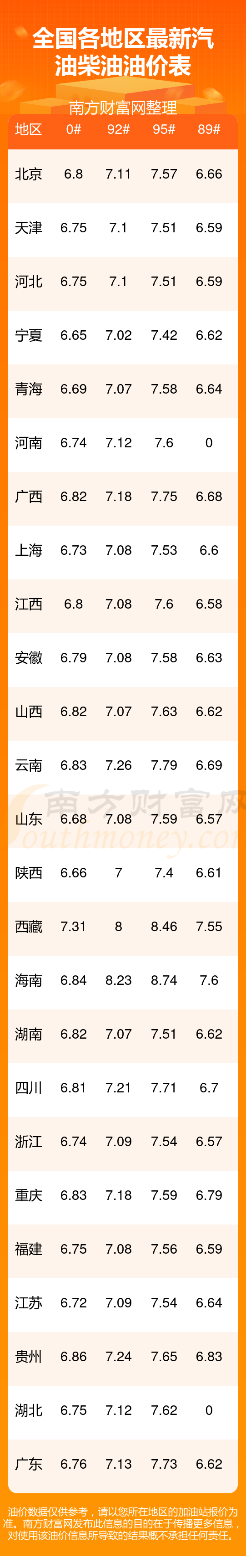 全国给地区油价调整一览表