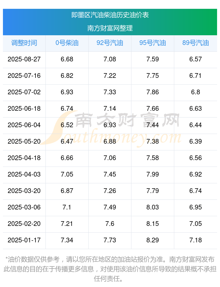 9月27日即墨区汽油柴油每升的价格为8月27日调整后的价格,具体如下:92号汽油7.08元;95号汽油7.59元;89号汽油6.57元;0号柴油6.68元。