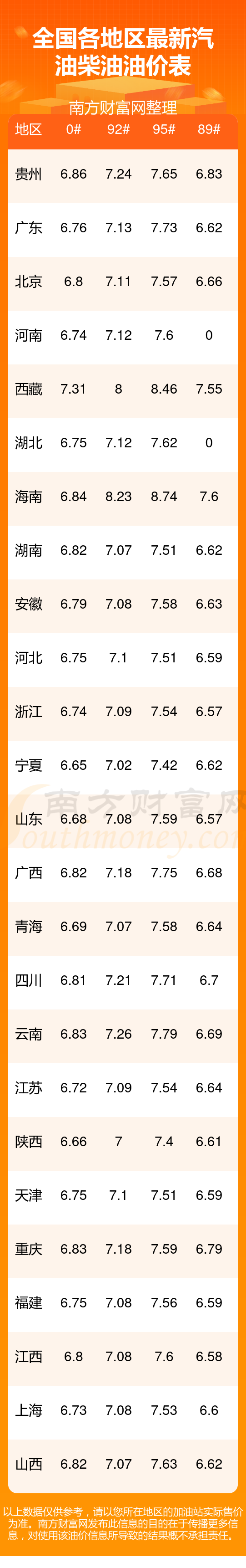 以上油价信息是当前市场上最新油价信息,油价数据仅供参考,实际在售油价可能有小幅偏差,请以您所在地区的加油站实际售价为准。