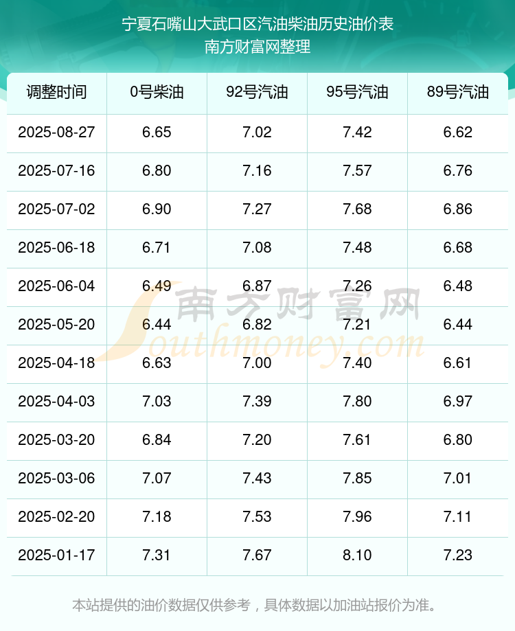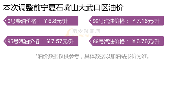 9月27日,宁夏石嘴山大武口区汽油、柴油每升的价格为8月27日调整后的价格,具体为:92号汽油为7.02元,跌了0.14元,跌幅达1.96%;95号汽油为7.42元,跌了0.15元,跌幅达1.98%;89号汽油为6.62元,跌了0.14元,跌幅达2.07%;0号柴油为6.65元,跌了0.15元,跌幅达2.21%。