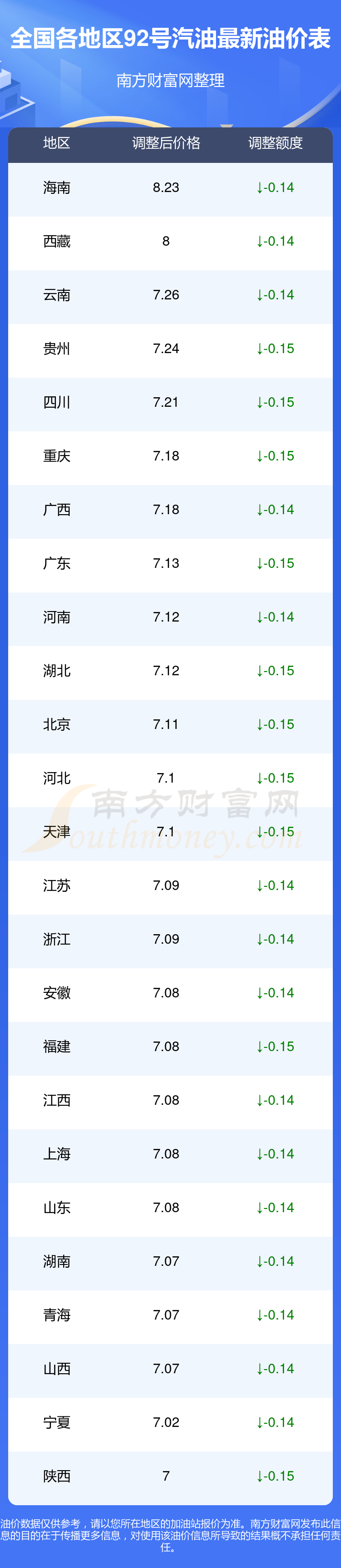 9月27日,全国92号汽油最新平均价格为:7元每升,调整时间为8月27日,其中,92号汽油最高为海南,价格为8.23元/升,全国92号汽油最低为陕西,价格为7.00元/升。