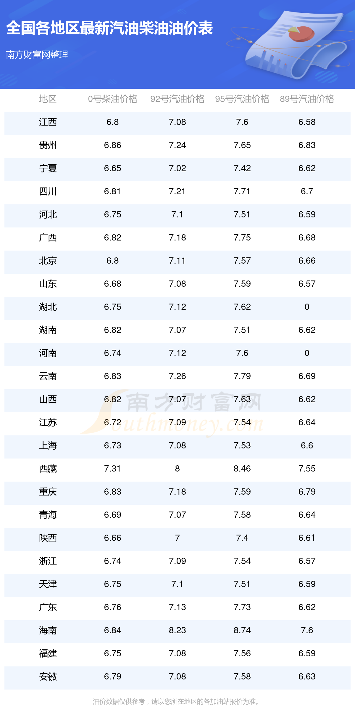 以上数据仅供参考,请以您所在地区的加油站实际售价为准。油价发布此信息的目的在于传播更多信息,对使用该油价信息所导致的结果概不承担责任。