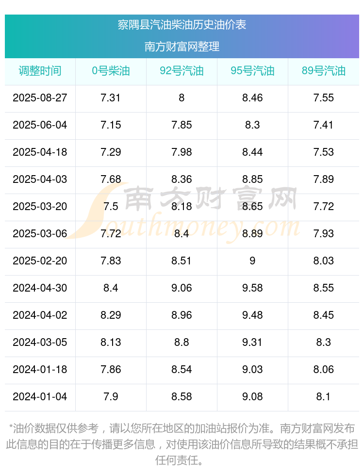 察隅县汽油、柴油9月27日每升的价格是多少?8月27日调整后的价格详情如下:92号汽油8元;95号汽油8.46元;89号汽油7.55元;0号柴油7.31元。