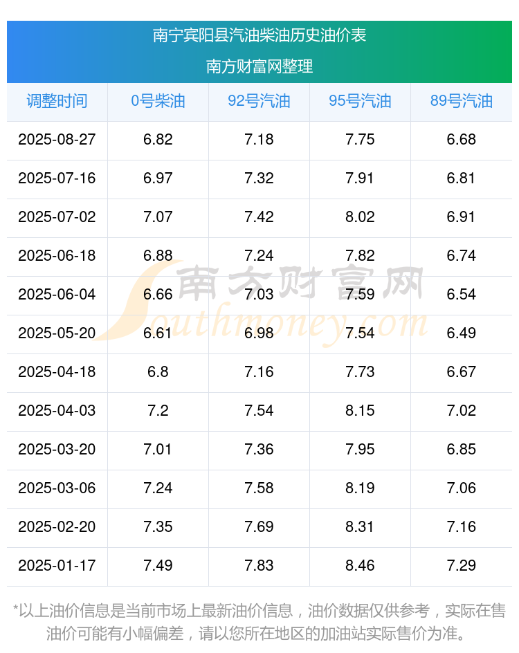 南宁宾阳县汽油、柴油9月27日每升的价格为8月27日调整后的价格,具体油价为:92号汽油7.18元;95号汽油7.75元;89号汽油6.68元;0号柴油6.82元。