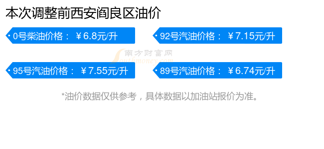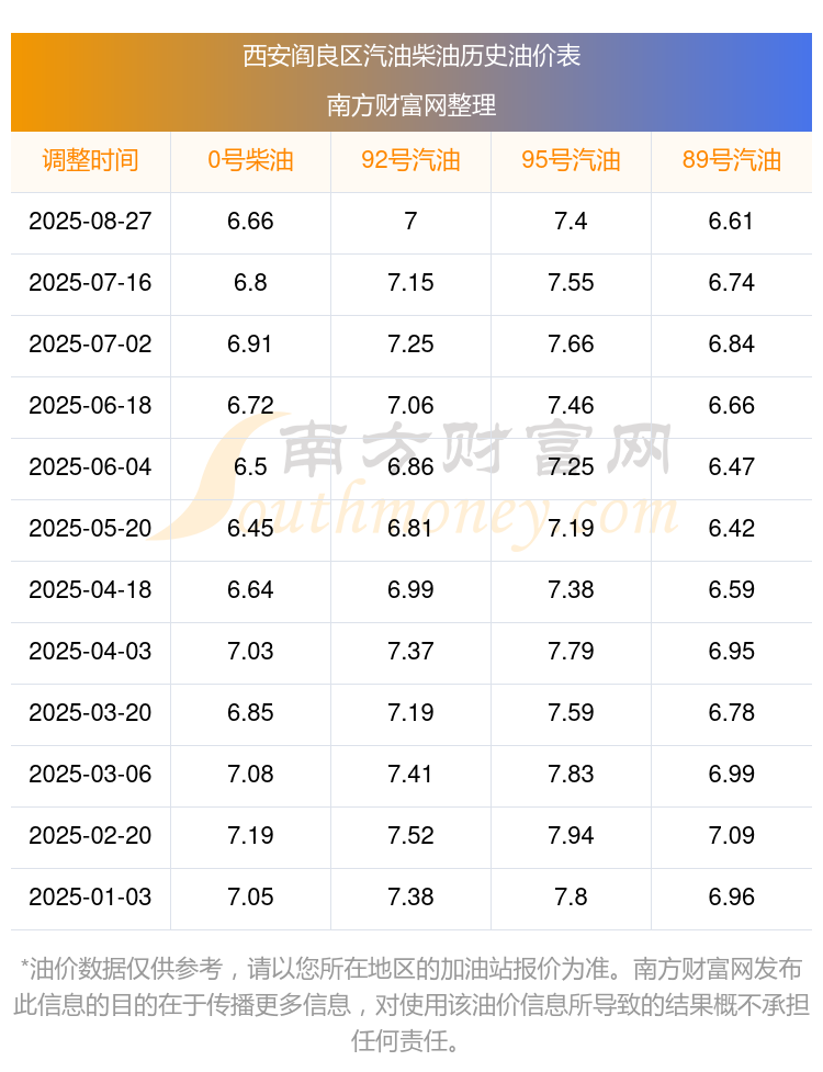 9月27日西安阎良区汽油、柴油每升的价格是8月27日调整后的价格:92号汽油为7元,下降了0.15元,下降幅达2.1%;95号汽油为7.4元,下降了0.15元,下降幅达1.99%;89号汽油为6.61元,下降了0.13元,下降幅达1.93%;0号柴油为6.66元,下降了0.14元,下降幅达2.06%。