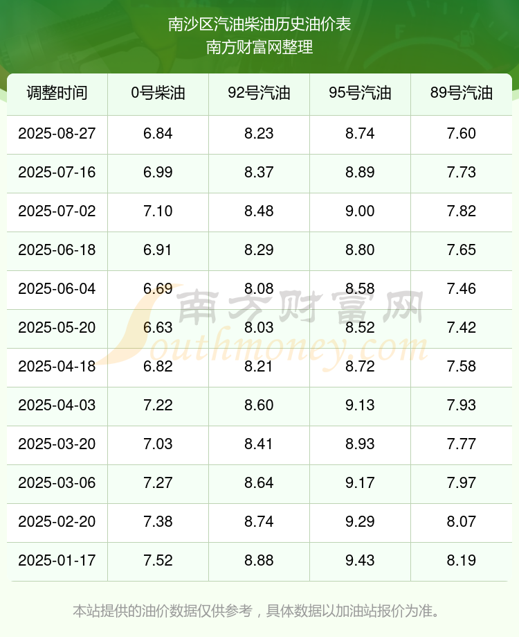 9月27日,南沙区汽油、柴油每升的价格为8月27日调整后的价格,具体为:92号汽油为8.23元,降了0.14元,降幅达1.67%;95号汽油为8.74元,降了0.15元,降幅达1.69%;89号汽油为7.6元,降了0.13元,降幅达1.68%;0号柴油为6.84元,降了0.15元,降幅达2.15%。