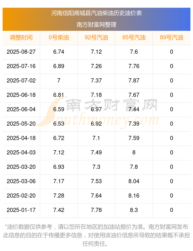 9月27日河南信阳商城县今日汽油价格如下:92号汽油7.12元;95号汽油7.6元;0号柴油6.74元(该价格为8月27日调整后的价格)。