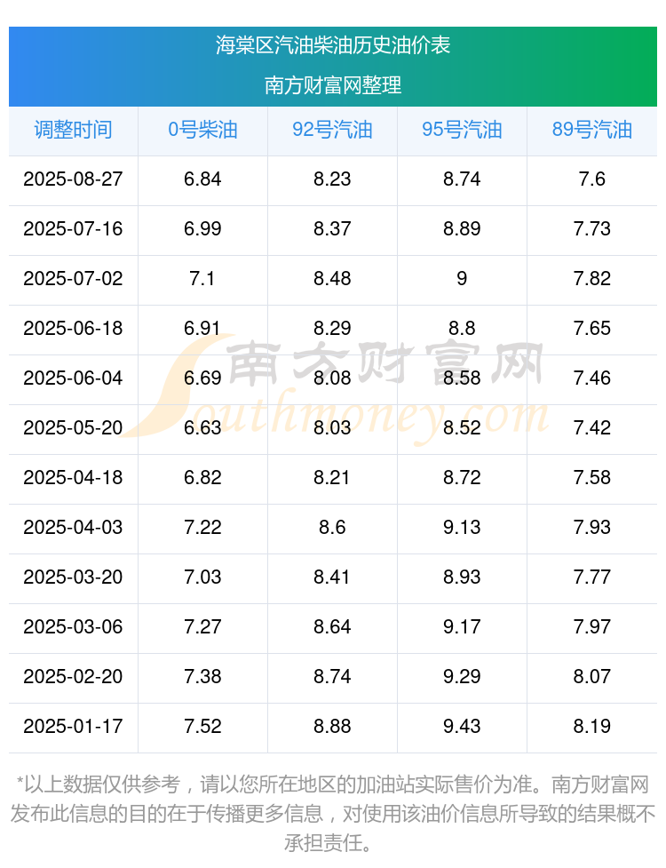 9月27日海棠区汽油、柴油每升的价格是8月27日调整后的价格:92号汽油为8.23元,下降了0.14元,下降幅达1.67%;95号汽油为8.74元,下降了0.15元,下降幅达1.69%;89号汽油为7.6元,下降了0.13元,下降幅达1.68%;0号柴油为6.84元,下降了0.15元,下降幅达2.15%。