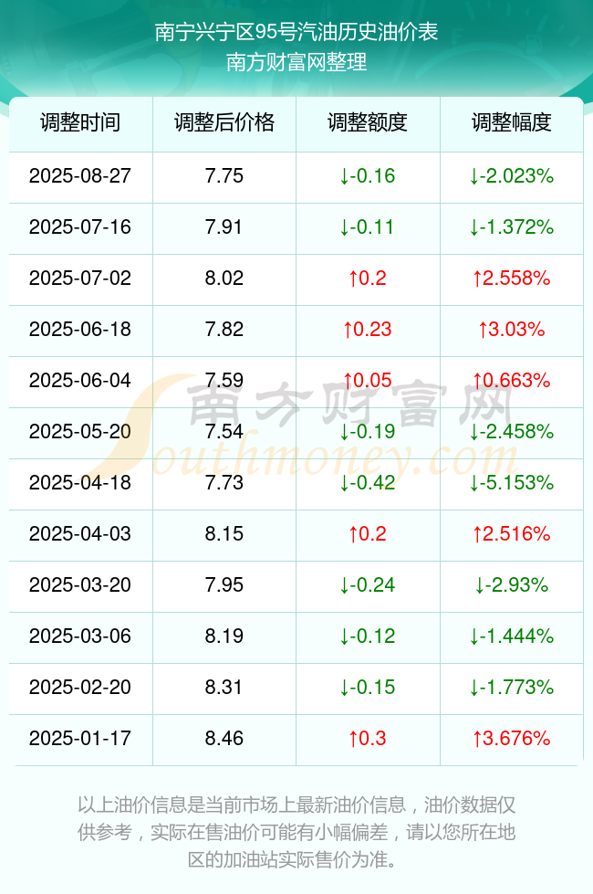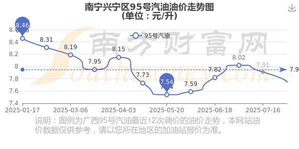 9月27日南宁兴宁区95号汽油的价格为7.75元/升,为8月27日油价调整后的价格,相对上次调整跌了0.16元,跌2.023%。