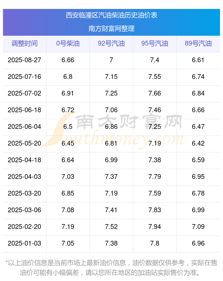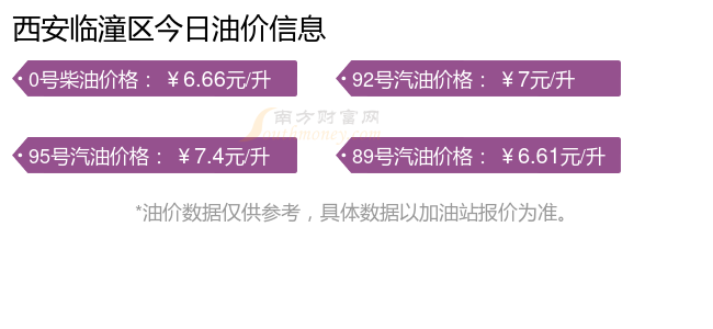 西安临潼区汽油、柴油9月27日每升的价格为(本轮油价调整时间为8月27日):92号汽油7元;95号汽油7.4元;89号汽油6.61元;0号柴油6.66元。