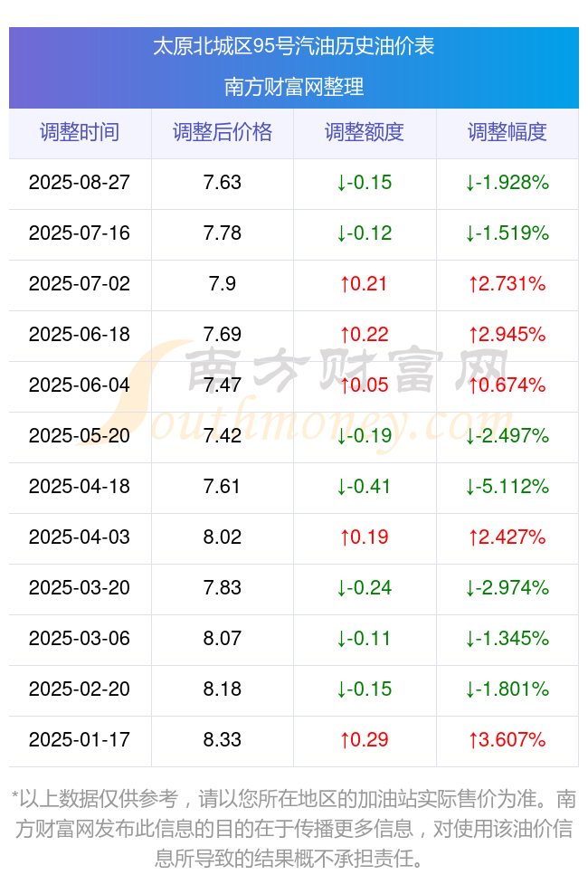 太原北城区95号汽油9月27日的价格为每升7.63元,本次油价的调整时间8月27日,对比上次油价调整时间7月16日的价格7.78元/升,共下跌了0.15元,下跌幅达1.928%。