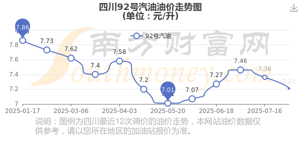 9月27日四川汽油、柴油最新价格:本次油价调整时间是8月27日,92号汽油7.21元,下跌了0.15元,下跌幅达2.04%;95号汽油7.71元,下跌了0.15元,下跌幅达1.91%;89号汽油6.7元,下跌了0.13元,下跌幅达1.9%;0号柴油6.81元,下跌了0.15元,下跌幅达2.16%。