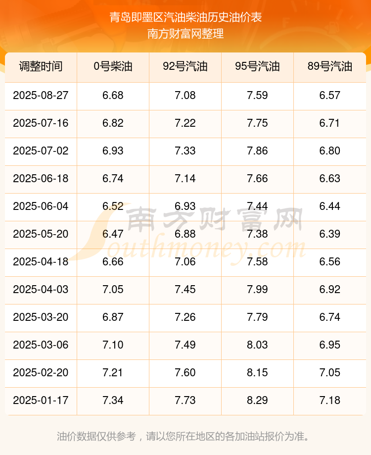 9月27日,青岛即墨区汽油、柴油每升最新价格:本轮的油价调整时间是8月27日,92号汽油为7.08元,下降了0.14元,下降幅达1.94%;95号汽油为7.59元,下降了0.16元,下降幅达2.07%;89号汽油为6.57元,下降了0.14元,下降幅达2.09%;0号柴油为6.68元,下降了0.14元,下降幅达2.05%。