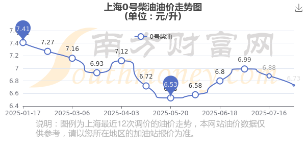 9月27日,上海0号柴油的价格是6.73元每升,本次的调整时间为8月27日,对比上次的调整跌了0.15元,跌2.18%,10月13日24时为下一轮油价调整时间,还有16.96天。