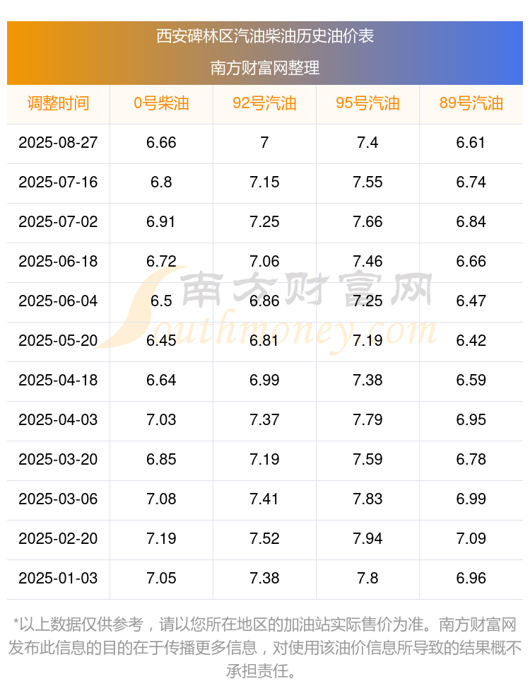 西安碑林区汽油、柴油9月27日每升的价格为(油价调整时间是8月27日):92号汽油7元;95号汽油7.4元;89号汽油6.61元;0号柴油6.66元。
